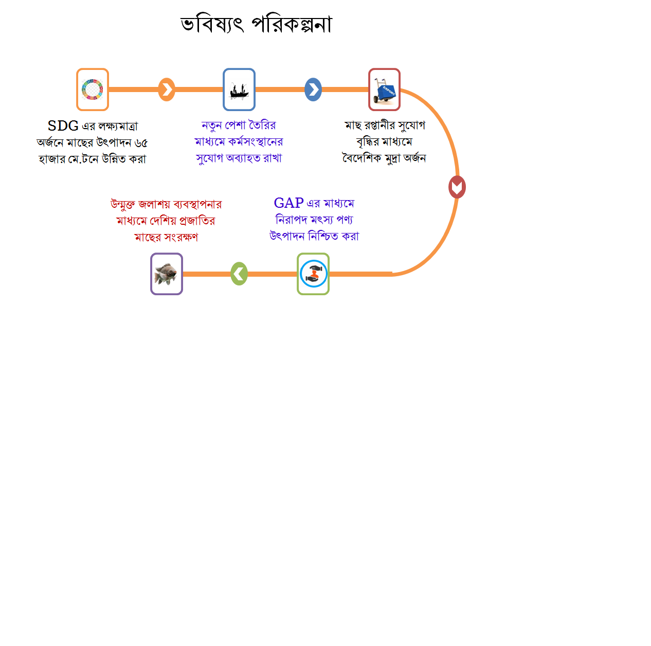 সরকারের নির্বাচনী ইশতেহার ও উন্নয়ন দর্শণ, প্রেক্ষিত পরিকল্পনা, ব-দ্বীপ পরিকল্পনা-২১০০, Allocation of Business অনুযায়ি মৎস্য ও প্রানিসম্পদ মন্ত্রণালয়ের নির্ধারিত ম্যান্ডেট, ২০৪১ সালের মধ্যে জ্ঞানভিত্তিক অর্থনীতি ও উদ্ভাবনী জাতি হিসাবে স্মার্ট এবং উন্নত-সমৃদ্ধ বাংলাদেশে উন্নীতকরণ এবং টেকসই উন্নয়ন অভীষ্ট (এসডিজি)-এ উল্লিখিত লক্ষ্যমাত্রা অর্জনের লক্ষ্যে ৮ম পঞ্চবার্ষিক পরিকল্পনায় (২০২১-২০২৫) মৎস্য সেক্টরে অর্জিতব্য প্রধান লক্ষ্যসমূহ নির্ধারণ করা হয়েছে: